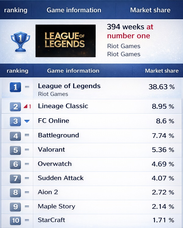 Помимо League of Legends и Lineage Classic, в топ-10 также входят такие игры, как Battleground, Valorant, Overwatch, Sudden Attack, Aion 2, MapleStory и StarCraft.