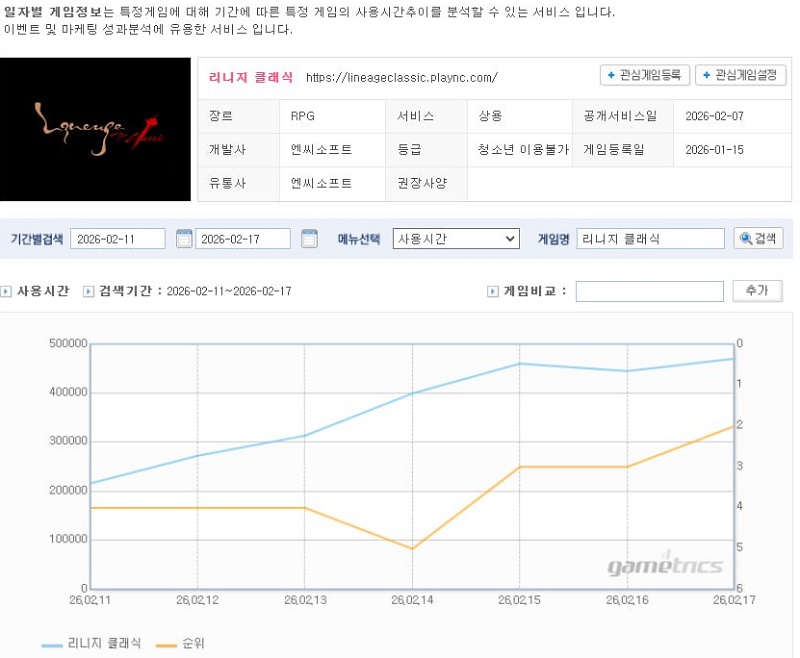 Сегодня, 18 февраля 2026 года, jambo в своём Telegram-канале опубликовал информацию и том, что версия Lineage Classic в Корее поднялась на второе место в рейтинге игр компьютерных клубов. Лидером рейтинга остаётся Лига Легенд (League of Legends), которая удерживает первое место с большим отрывом уже 2758 дней (около 7,5 лет).