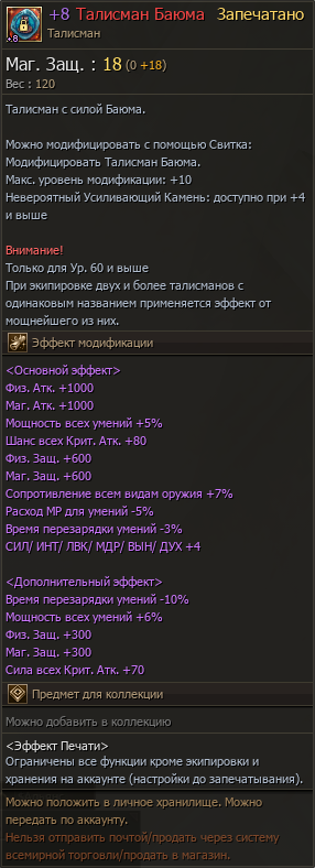 В середине июня мы писали о том, что данному игроку удалось заточить +7 Талисман Баюма, затем этот предмет был сломан и восстановлен за Чёрный Купон, а теперь он удачно модифицировался на +8. Предмет точился всегда обычными свитками.