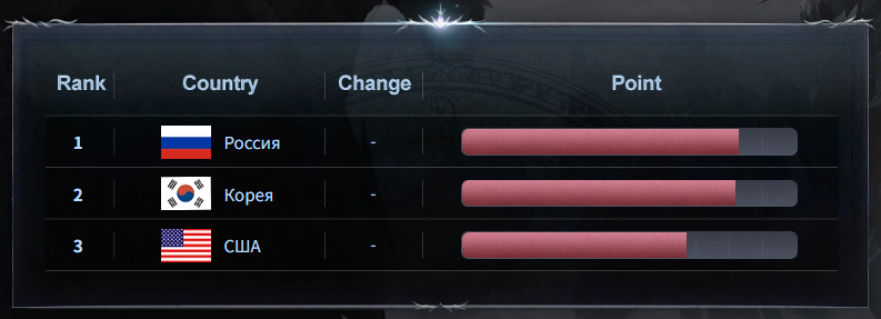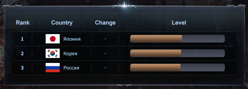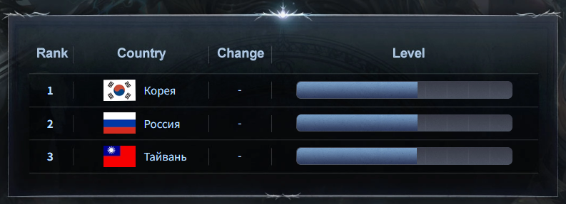 В середине месяца мы сообщали, что Россия вышла на первое место в рейтинге по среднему уровню персонажей (подробнее — здесь). Однако к текущему моменту нас обошли корейские игроки: Россия занимает второе место, а третьей идёт команда из Тайваня.
