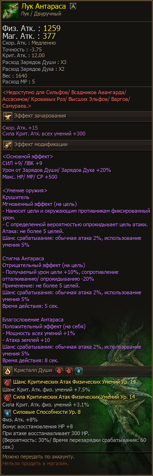 В итоге оружие удалось модифицировать до +10, после чего с первой попытки было создано Оружие Дракона — Лук Антараса.