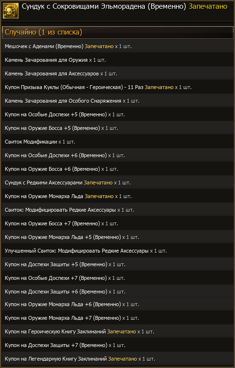 Содержимое лутбокса «Сундук с Сокровищами Эльморадена»: